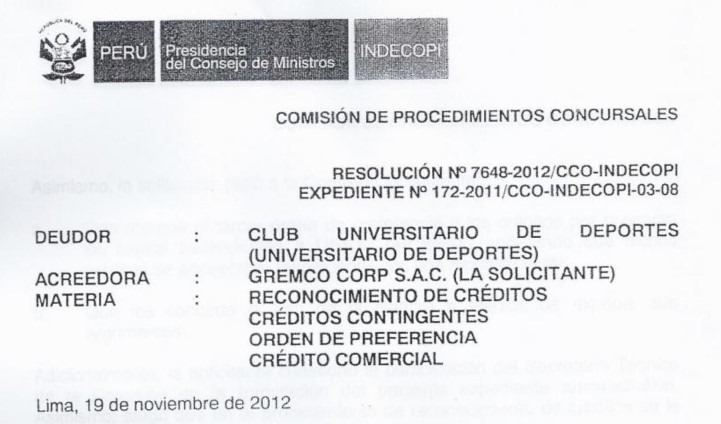 Por solicitud de fecha 27 de abril de 2012, complementado por escritos de fecha veinticuatro de mayo, ocho de junio, diez de agosto, quince de agosto, dieciséis de agosto, veinticuatro de agosto, treinta de octubre, cinco de noviembre y doce de noviembre de dos mil doce, presentados dentro del procedimiento concursal que se tramita ante el INDECOPI, en el expediente 172-2011/CCO-INDECOPI-03-08, la empresa Gremco Corp, solicitó a la Comisión de Procedimientos Concursales se le reconozca como acreedor del Club Universitario de Deportes en virtud del Laudo Arbitral de fecha veinticinco de julio de dos mil siete, el mismo que es corregido e integrado por la Resolución 203, del veintidós de agosto de dos mil siete.