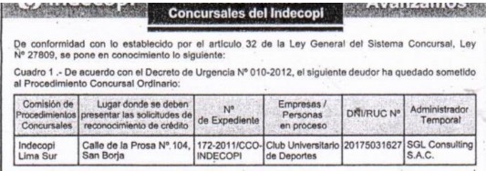 1. INDECOPI DECLARÓ EL INICIO DEL PROCESO CONCURSAL DEL CLUB UNIVERSITARIO DE DEPORTES