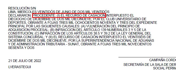 17. FINAL : CORTE SUPERIOR DE JUSTICIA – PRIMERA SALA CONSTITUCIONAL DECLARA IMPROCEDENTE DEMANDA DE AMPARO DEL CLUB CONTRA SENTENCIA DE CASACIÓN