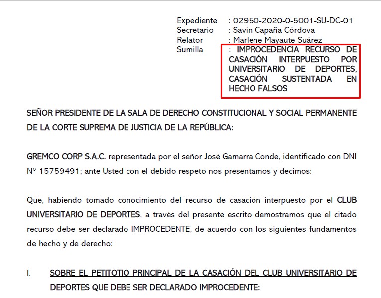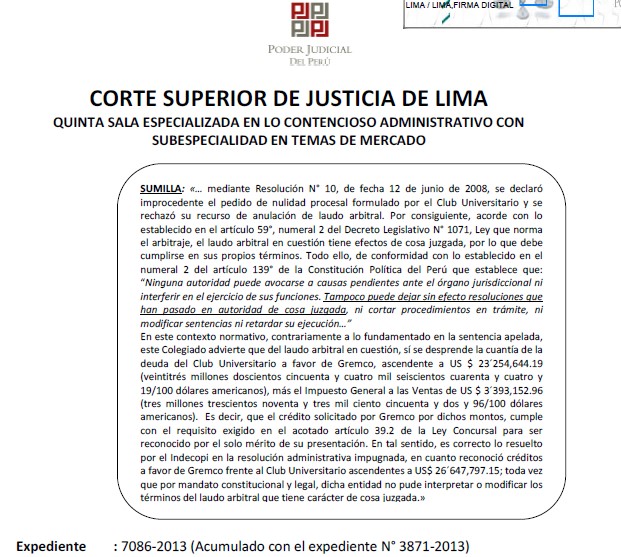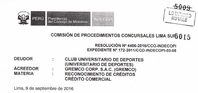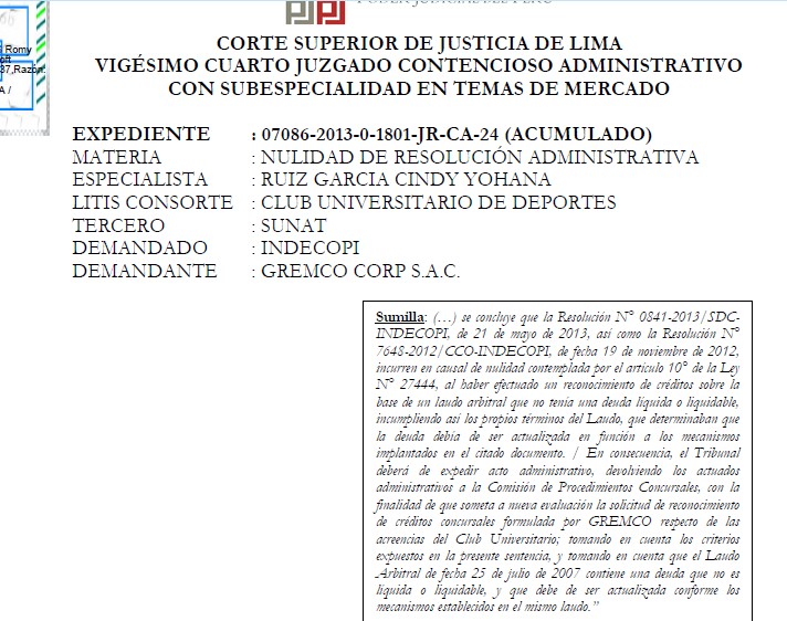 Por solicitud de fecha 27 de abril de 2012, complementado por escritos de fecha veinticuatro de mayo, ocho de junio, diez de agosto, quince de agosto, dieciséis de agosto, veinticuatro de agosto, treinta de octubre, cinco de noviembre y doce de noviembre de dos mil doce, presentados dentro del procedimiento concursal que se tramita ante el INDECOPI, en el expediente 172-2011/CCO-INDECOPI-03-08, la empresa Gremco Corp, solicitó a la Comisión de Procedimientos Concursales se le reconozca como acreedor del Club Universitario de Deportes en virtud del Laudo Arbitral de fecha veinticinco de julio de dos mil siete, el mismo que es corregido e integrado por la Resolución 203, del veintidós de agosto de dos mil siete.