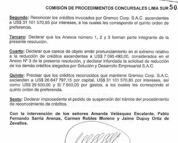 Mediante Resolución No. 4406-2016 CCO-INDECOPI del 09 de septiembre 2016 la Comisión de Procedimientos Concursales INDECOPI reconoce los créditos (contingente) invocados por GREMCO respecto a los intereses por US$31,101,570.
