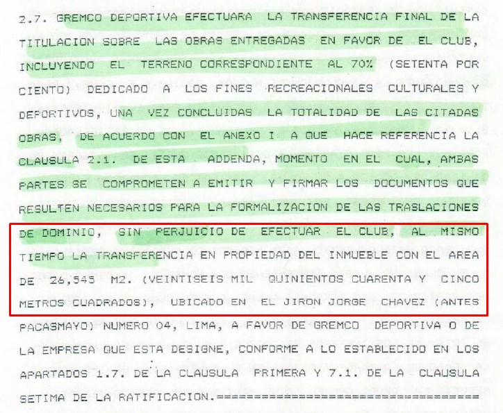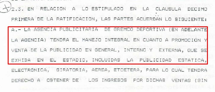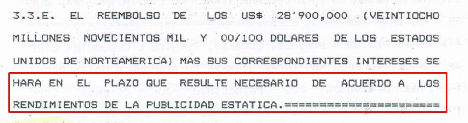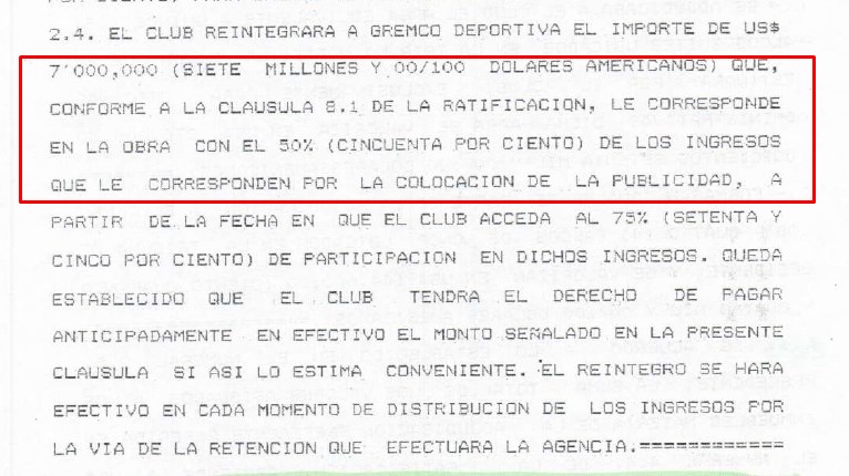 El 19 de Febrero de 1998 se suscribe una primera adenda al contrato en la cual el Club reconoce que pagará a GREMCO $7 millones con publicidad estática,