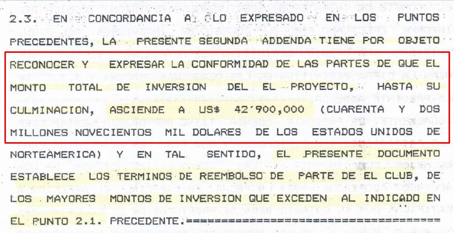 El 24 de Febrero de 1999 se suscribe una segunda adenda al contrato en la cual GREMCO establece que el monto total de la obra asciende a $42.9 millones, lo cual será ratificado por un comité de ingenieros, en cuyo caso el Club aceptará reembolsar a GREMCO hasta un límite de $28.9 millones con publicidad estática, incluyendo intereses TAMEX al rebatir y el impuesto general a las ventas, en el plazo que resulte necesario de acuerdo a los rendimientos de la publicidad estática.